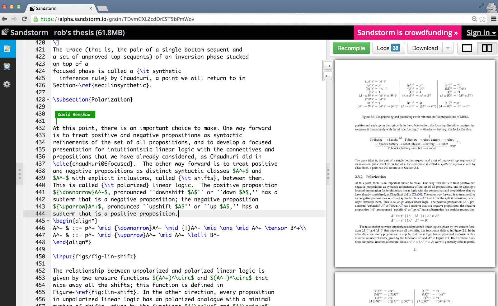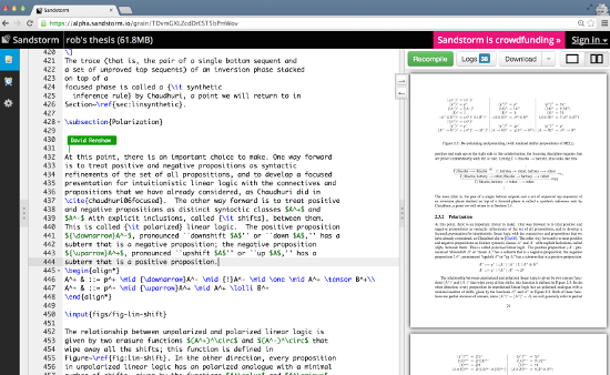 Using ShareLaTeX in Sandstorm to typeset Rob Simmons's PhD thesis.