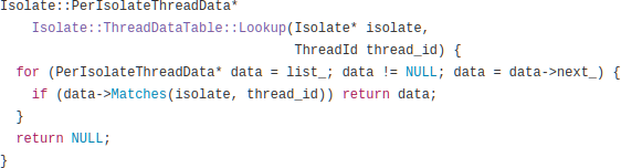 You might be surprised to see the word “thread” in V8, which implements Javascript, a language known for being almost militantly opposed to threads. It turns out, though, that V8 supports “green threads” – simulated threads implemented entirely in userspace, with cooperative switching. Node users can take advantage of this via the node-fibers npm package. This package allows you to avoid Node’s “callback hell” by instead instantiating arbitrarily many call stacks and jumping between them whenever you need to wait for an asynchronous operation. Our code was, in fact, using node-fibers, mostly because we built on Meteor, which uses fibers by default.