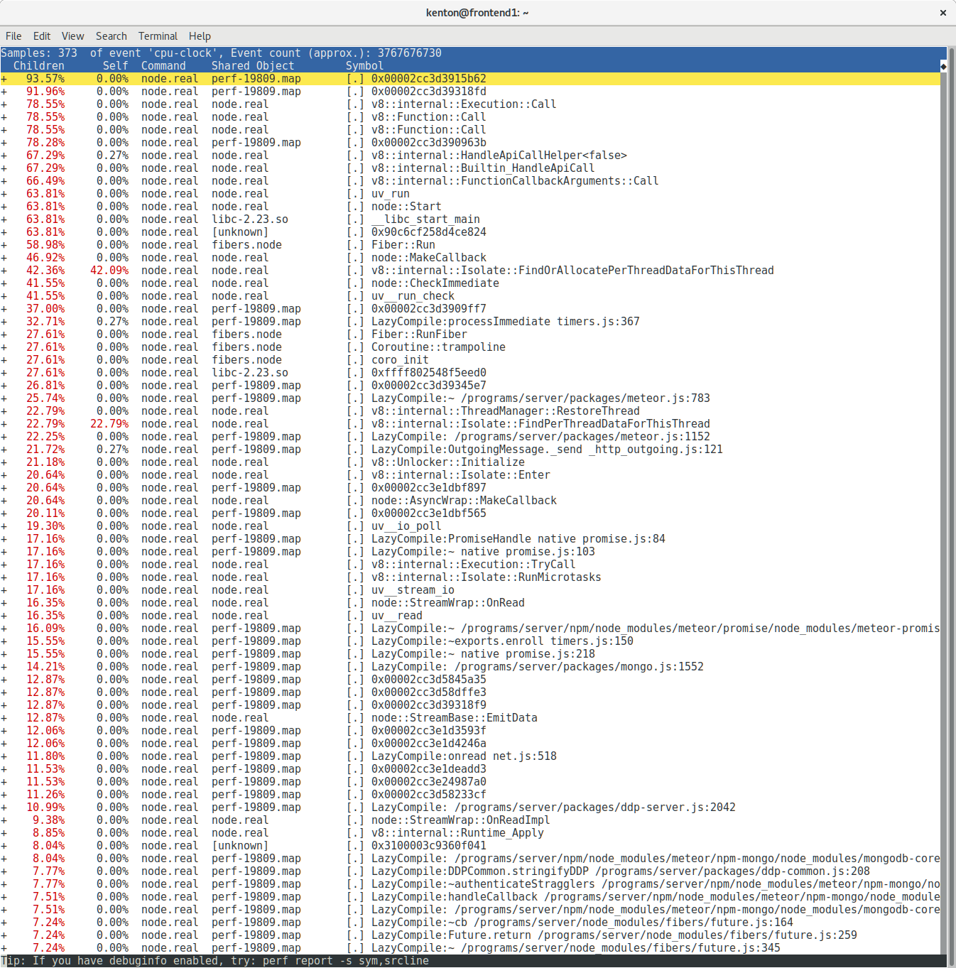 Armed with this new knowledge, we waited. Finally, after a few days, my pager went off. I shelled into the broken server, recorded a ten-second profile, restarted Node, and then downloaded the data for analysis. Upon running perf, I was presented with this: