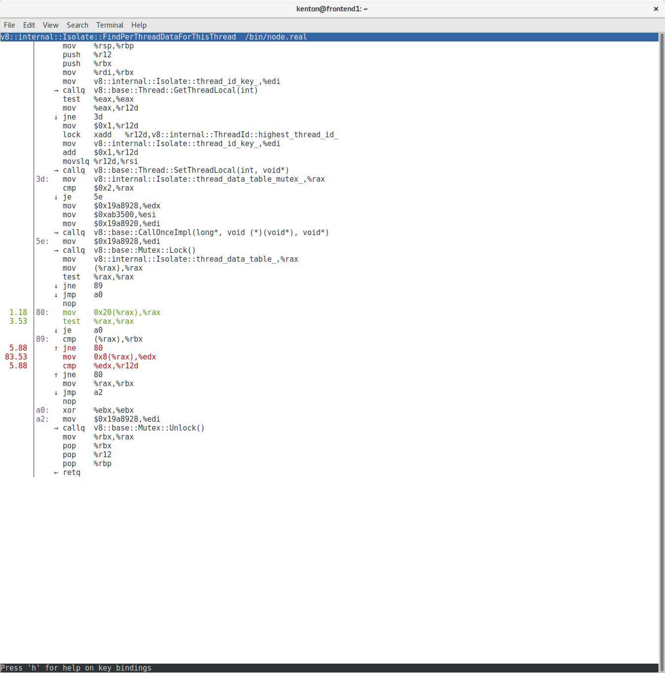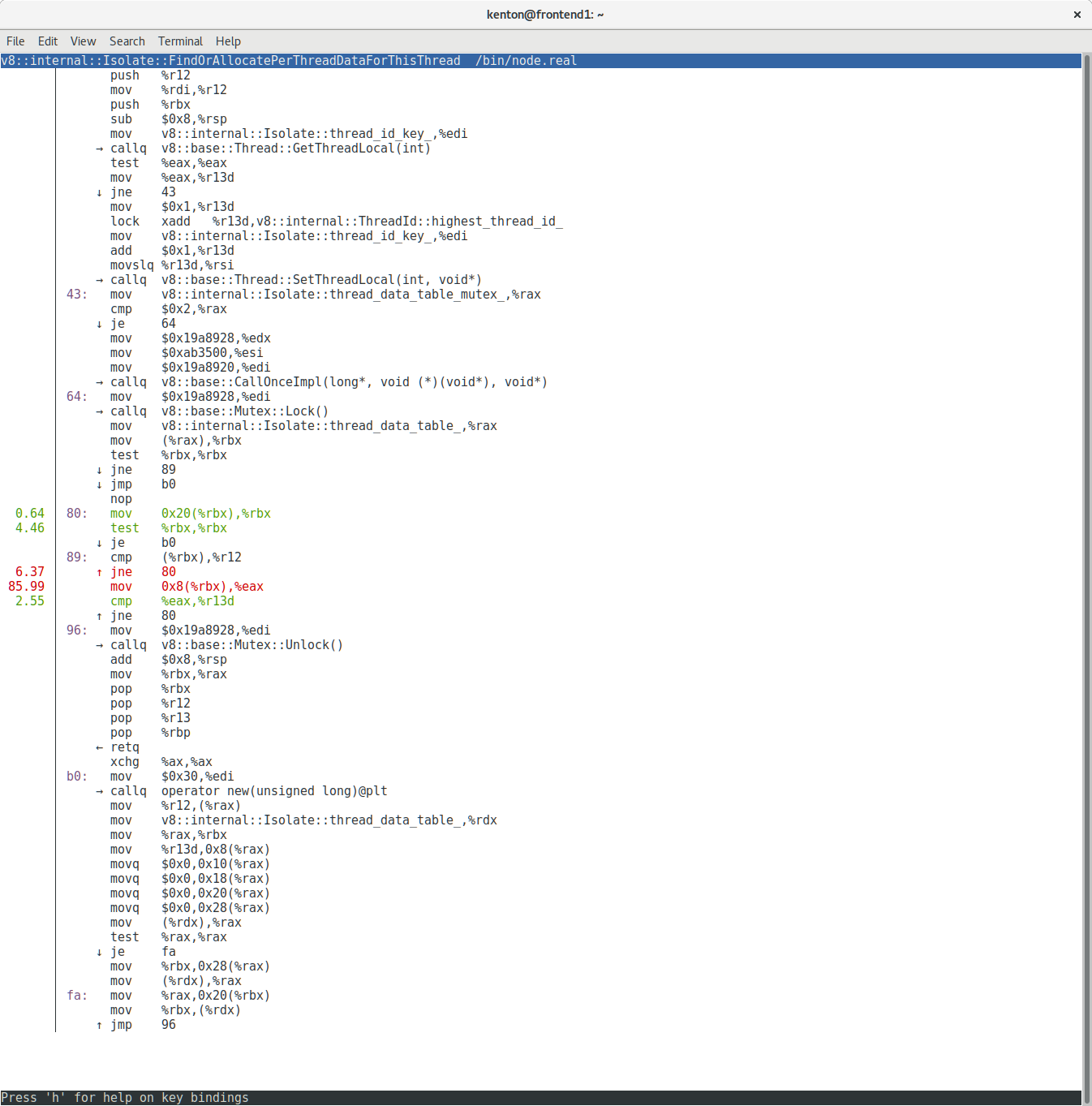 Well, this looks promising! Almost all the time is being spent in two C++ functions! The perf viewer makes it easy to jump directly into the disassembly: